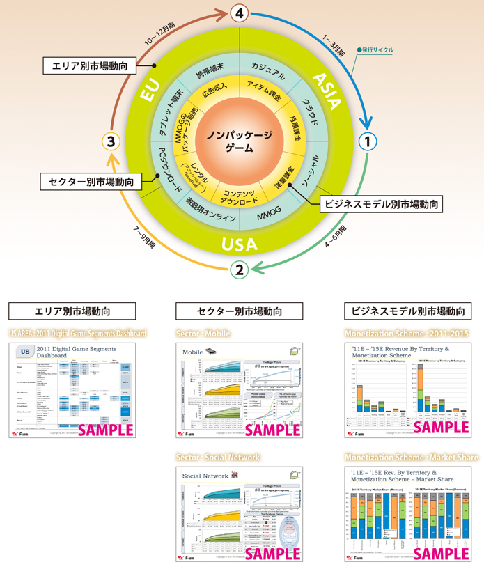 これまで情報収集が極めて困難だった、家庭用パッケージゲーム以外のゲーム・ニューセクター市場動向を、世界規模で徹底的に調査。ゲームに特化したノウハウを持つエンターブレインだから可能な世界のノンパッケージゲーム・レポートの決定版です。世界の主なエリア別のほか、さらに詳細にセクター別、ビジネスモデル別に集計し、年間を通じ4回のレポートに分けてお届けします。